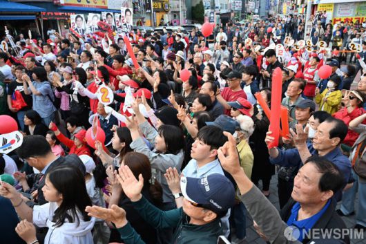 [당진=뉴스핌] 최지환 기자 =김문수 국민의힘 대선후보 지지자들이 25일 충남 당진시장에서 김 후보의 연설을 듣고 호응하고 있다. 2025.05.25 choipix16@newspim.com