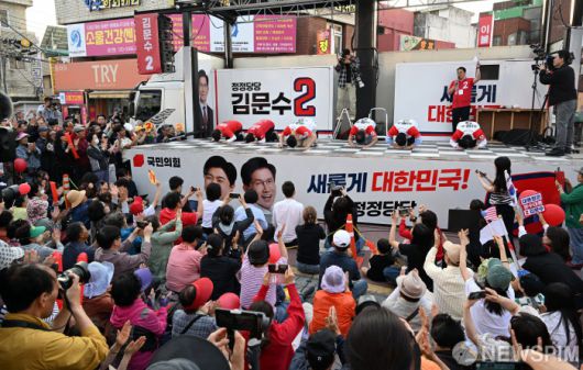 [당진=뉴스핌] 최지환 기자 =김문수 국민의힘 대선후보가 25일 충남 당진시장에서 지지자들을 향해 큰 절을 하고 있다.2025.05.25 choipix16@newspim.com