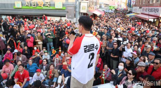[당진=뉴스핌] 최지환 기자 = 김문수 국민의힘 대선 후보가 25일 충남 당진시장 오거리에서 열린 유세에서 지지를 호소하고 있다. 2025.05.25 choipix16@newspim.com