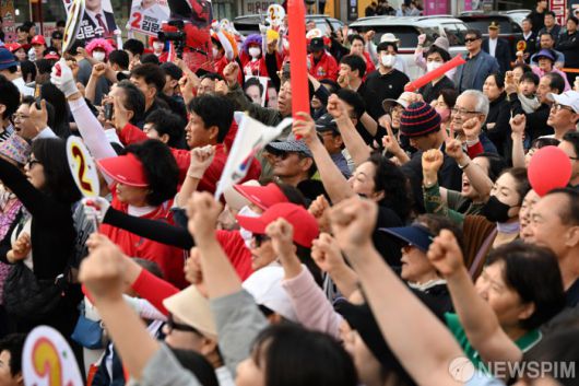 [당진=뉴스핌] 최지환 기자 = 김문수 국민의힘 대선후보 지지자들이 25일 충남 당진시장에서 김 후보를 외치고 있다. 2025.05.25 choipix16@newspim.com
