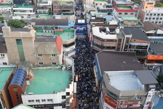 (천안=뉴스1) 안은나 기자 = 이재명 더불어민주당 대통령 후보가 캐스팅보트인 충청권 공략에 나선 25일 오후 충남 천안시 신부문화거리를 찾아 지지를 호소하고 있다. (공동취재) 2025.5.25/뉴스1