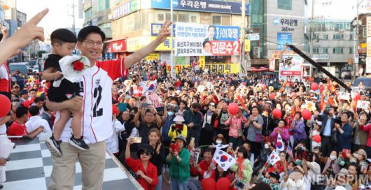 [당진=뉴스핌] 최지환 기자 = 김문수 국민의힘 대선 후보가 25일 충남 당진시장 오거리에서 열린 유세에서 한 어린이를 안고 지지를 호소하고 있다. 2025.05.25 choipix16@newspim.com