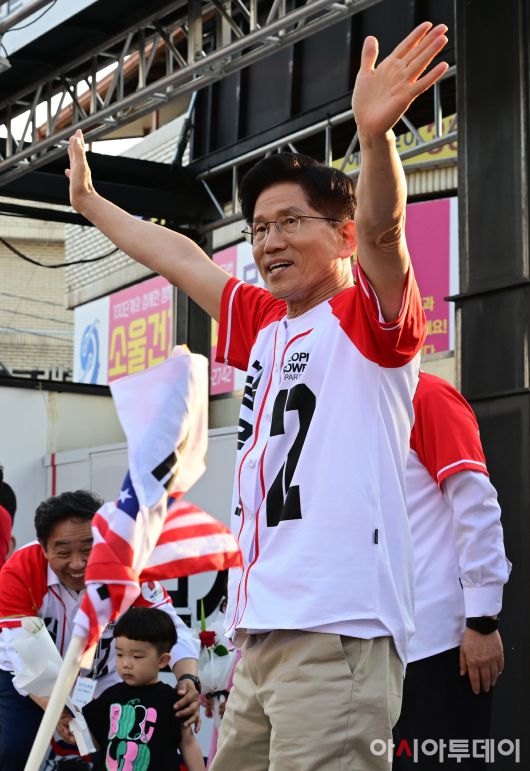 아시아투데이 (당진) 이병화 기자 = 김문수 국민의힘 대통령 후보가 캐스팅보트인 충청권 공략에 나선 25일 충남 당진전통시장을 찾아 지지를 호소하고 있다.