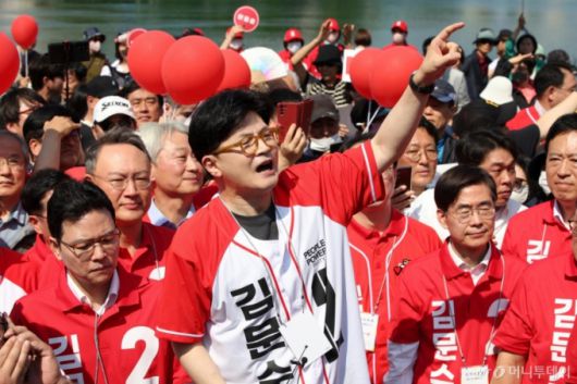 한편 한 전 대표는 이날 유세에서 김 후보의 이름이 적힌 국민의힘 선거 운동복을 입고 유세에 나섰다. 한 전 대표가 김 후보의 이름이 적힌 옷을 입은 것은 이날이 처음이다.