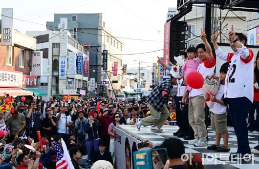아시아투데이 (당진) 이병화 기자 = 김문수 국민의힘 대선후보가 캐스팅보트인 충청권 공략에 나선 25일 충남 당진전통시장을 찾아 한 어린이를 안고 시민들에게 인사하고 있다. |