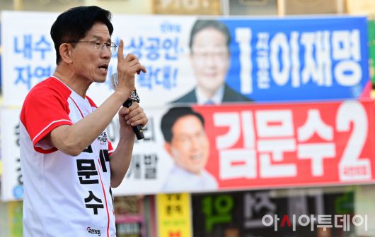아시아투데이 (당진) 이병화 기자 = 김문수 국민의힘 대통령 후보가 캐스팅보트인 충청권 공략에 나선 25일 충남 당진전통시장을 찾아 지지를 호소하고 있다.