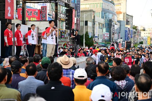 아시아투데이 (당진) 이병화 기자 = 김문수 국민의힘 대통령 후보가 캐스팅보트인 충청권 공략에 나선 25일 충남 당진전통시장을 찾아 지지를 호소하고 있다.