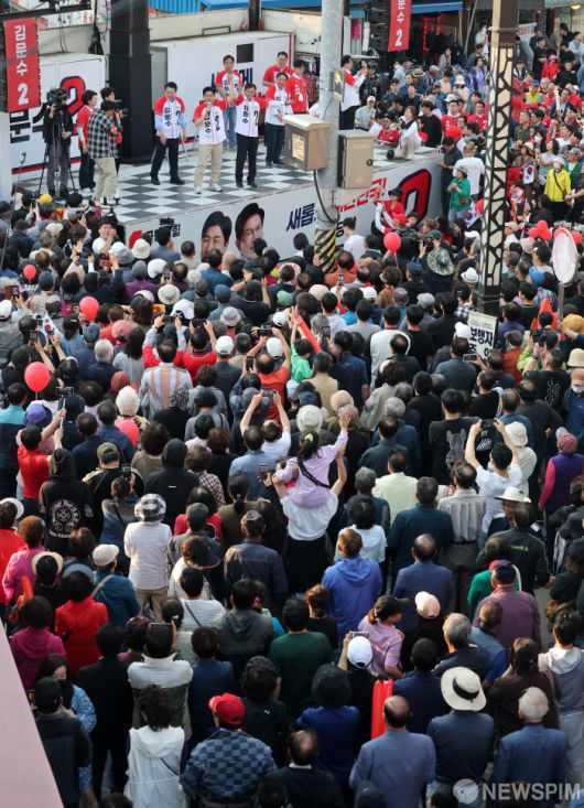 [당진=뉴스핌] 최지환 기자 = 김문수 국민의힘 대선 후보가 25일 충남 당진시장 오거리에서 열린 유세에서 지지를 호소하고 있다. 2025.05.25 choipix16@newspim.com