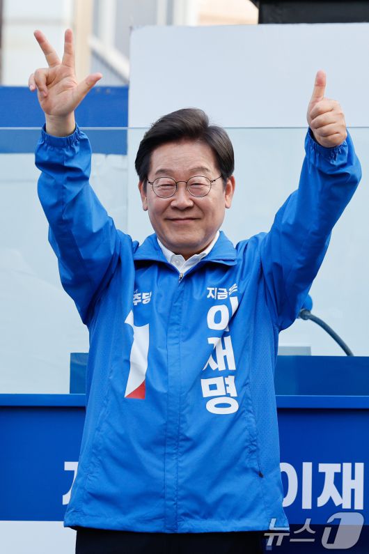 (천안=뉴스1) 안은나 기자 = 이재명 더불어민주당 대통령 후보가 캐스팅보트인 충청권 공략에 나선 25일 오후 충남 천안시 신부문화거리를 찾아 '1번 이재명 3표 더'라는 의미의 손가락을 들어보이고 있다. 2025.5.25/뉴스1coinlocker@news1.krCopyright ⓒ 뉴스1. All rights reserved. 무단 전재 및 재배포, AI학습 이용 금지.