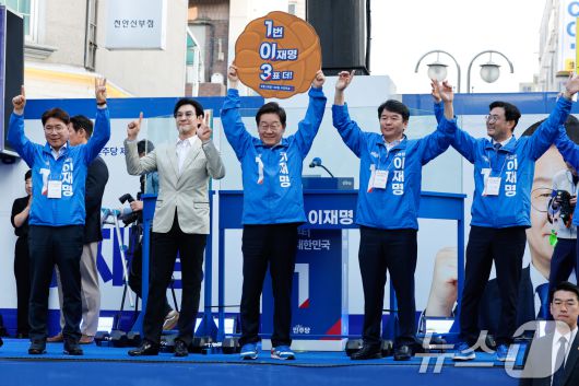 (천안=뉴스1) 안은나 기자 = 이재명 더불어민주당 대통령 후보가 캐스팅보트인 충청권 공략에 나선 25일 오후 충남 천안시 신부문화거리를 찾아 문진석 충남도당 위원장으로부터 '1번 이재명 3표 더!'라고 적힌 호두과자 모양 피켓을 받은 뒤 들어보이고 있다. 2025.5.25/뉴스1