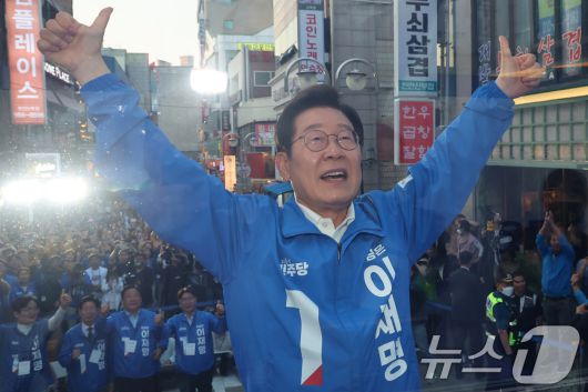 (천안=뉴스1) 안은나 기자 = 이재명 더불어민주당 대통령 후보가 캐스팅보트인 충청권 공략에 나선 25일 오후 충남 천안시 신부문화거리를 찾아 두팔을 번쩍 들며 인사하고 있다. (공동취재) 2025.5.25/뉴스1coinlocker@news1.krCopyright ⓒ 뉴스1. All rights reserved. 무단 전재 및 재배포, AI학습 이용 금지.