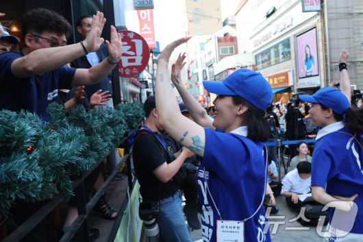 (천안=뉴스1) 안은나 기자 = 이재명 더불어민주당 대통령 후보가 캐스팅보트인 충청권 공략에 나선 25일 오후 충남 천안시 신부문화거리에서 선거운동원들이 열띤 유세를 펼치고 있다. (공동취재) 2025.5.25/뉴스1coinlocker@news1.krCopyright ⓒ 뉴스1. All rights reserved. 무단 전재 및 재배포, AI학습 이용 금지.