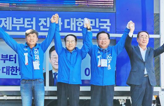 김부겸 (사진오른쪽 두번째) 더불어민주당 중앙당 총괄선거대책위원장이 지난 12일 민주당 구미지역선거대책위원회 선거운동 출정식에 참가해 지원 유세를 펼치고 있다. [민주당 경북도당 제공] |