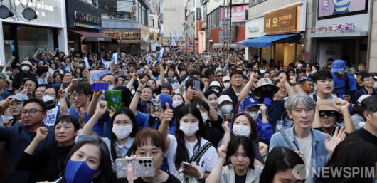 [천안=뉴스핌] 김학선 기자 = 25일 충남 천안시 신부문화거리에서 지지자들이 이재명 더불어민주당 대선후보의 연설을 듣고 있다. 2025.05.25 yooksa@newspim.com