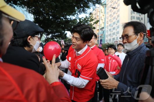 (제주=뉴스1) 홍수영 기자 = 김용태 국민의힘 비상대책위원장이 25일 제주시 노형동 제주우편집중국앞 교차로에서 김문수 대통령 후보 지지를 호소하고 있다. 2025.5.25/뉴스1