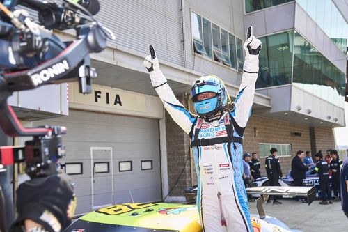 슈퍼레이스 챔피언십 2라운드에서 우승한 뒤 기뻐하는 박규승 |