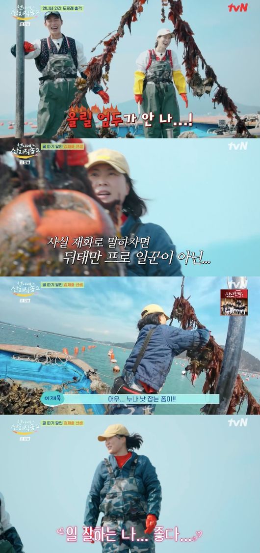 150kg 굴더미를 올려하는 상황 속 이재욱은 “올릴 엄두가 안나”라고 했고, 김재화는 “바꿔줄게”라며 나섰다. 이재욱이 “누나 쉽게 볼일 아니다”라고 했지만, 김재화는 올라온 굴더미에 알아서 척척 줄을 고정시킨 뒤 작업을 했다.