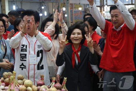 (서울=뉴스1) = 김문수 국민의힘 대통령 후보 배우자 설난영 여사가 25일 경기 평택 통복시장을 방문해 상인들을 만나고 있다. (국민의힘 제공. 재판매 및 DB금지) 2025.5.25/뉴스1kimkim@news1.krCopyright ⓒ 뉴스1. All rights reserved. 무단 전재 및 재배포, AI학습 이용 금지.