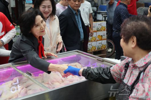 (서울=뉴스1) = 김문수 국민의힘 대통령 후보 배우자 설난영 여사가 25일 경기 평택 통복시장을 방문해 상인들을 만나고 있다. (국민의힘 제공. 재판매 및 DB금지) 2025.5.25/뉴스1kimkim@news1.krCopyright ⓒ 뉴스1. All rights reserved. 무단 전재 및 재배포, AI학습 이용 금지.