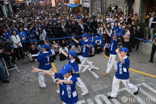 [천안=뉴스핌] 김학선 기자 = 더불어민주당 선거유세단 '샤우팅코리아' 팀이 25일 충남 천안시 동남구 신부문화거리에서 이재명 민주당 대선 후보를 기다리며 분위기를 끌어올리고 있다. 2025.05.25 yooksa@newspim.com