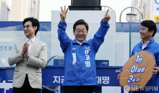 '1번 이재명 3표' 퍼포먼스하는 이재명 후보
