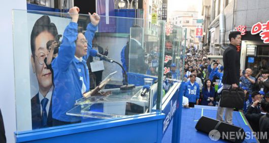 천안 신부문화거리에서 유권자 만나는 이재명 더불어민주당 대선 후보