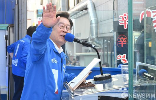 [천안=뉴스핌] 김학선 기자 = 이재명 더불어민주당 대선 후보가 25일 충남 천안시 동남구 신부문화거리에서 지지를 호소하고 있다. 2025.05.25 yooksa@newspim.com