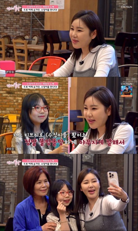 25일 방송된 TV CHOSUN '엄마의 봄날'에 출연한 송가인이 '미스트롯3' 최연소 참가자 한수정과 그의 할머니를 만났다.