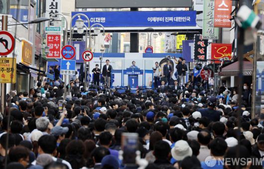 천안시 신부문화거리 인파속 연설하는 이재명 후보