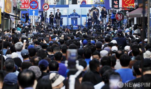 [천안=뉴스핌] 김학선 기자 = 이재명 더불어민주당 대선후보가 25일 오후 충남 천안시 신부문화거리에서 연설을 하고 있다.2025.05.25 yooksa@newspim.com