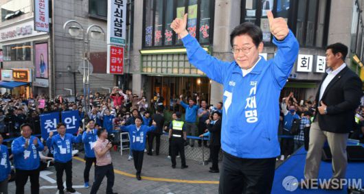 [천안=뉴스핌] 김학선 기자 = 이재명 더불어민주당 대선 후보가 25일 충남 천안시 동남구 신부문화거리에서 지지를 호소하고 있다. 2025.05.25 yooksa@newspim.com