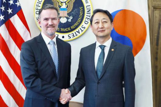 안덕근 산업통상자원부 장관이 지난달 24일(현지시간) 미국 워싱턴DC 무역대표부(USTR) 회의실에서 제이미슨 그리어 미국 무역대표부 대표와 악수하며 기념 촬영하고 있다. 연합뉴스 |