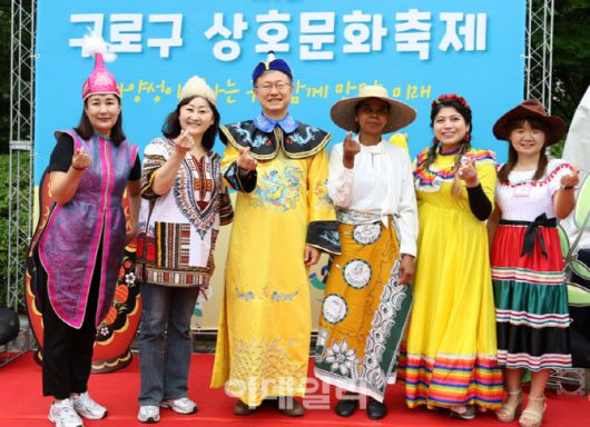[이데일리 김태형 기자] 장인홍(가운데) 구로구청장이 24일 신도림 오페라하우스에서 열린 ‘제7회 구로구 상호문화축제’에서 세계전통의상 체험을 하고 기념촬영을 하고 있다.