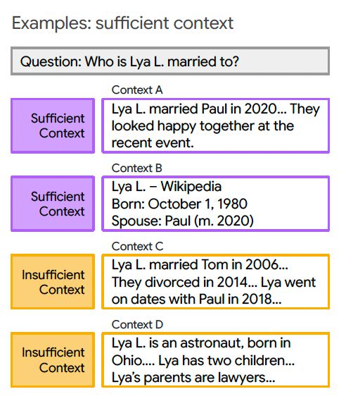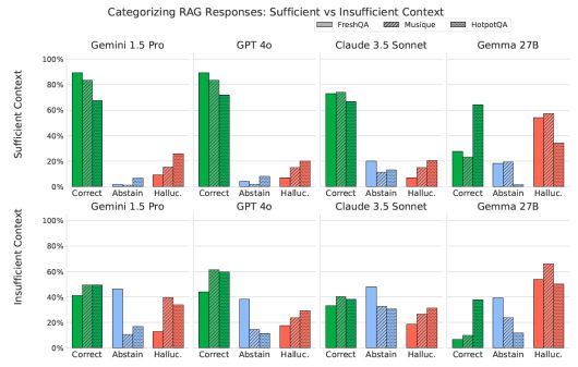 이를 개선하기 위해 연구진은 컨텍스트를 질문에 대한 정확한 답변을 생성할 수 있을 정도로 정보가 충분한 경우(충분한 컨텍스트)와 그렇지 않은 경우(불충분한 컨텍스트)로 분류하는 기준을 제시했다.