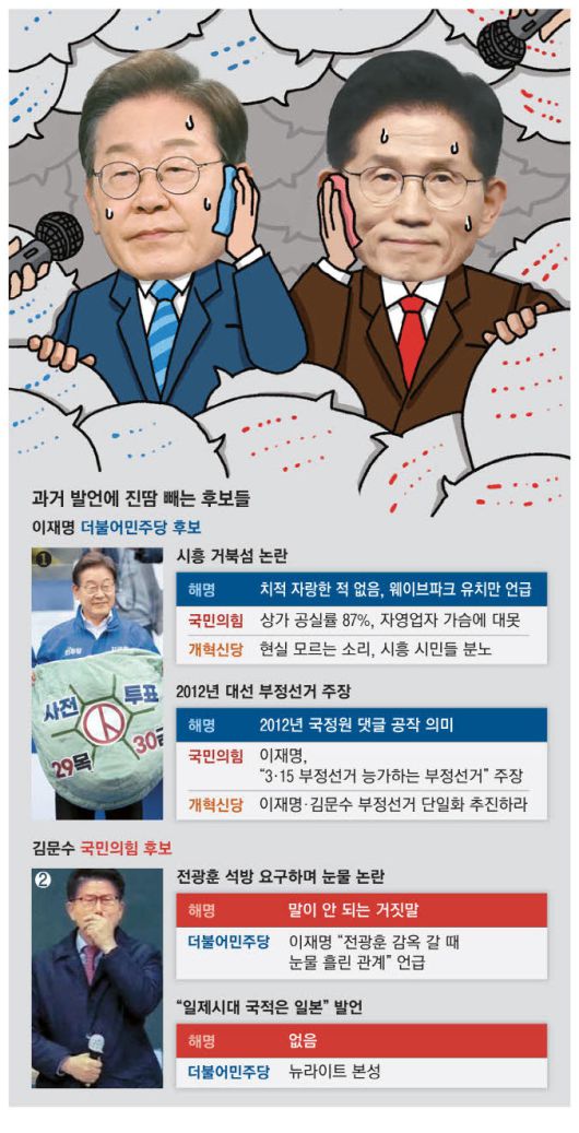후보들이 과거 했던 발언이나 행동에 발목을 잡히는 모습도 나타나고 있다. 김문수 국민의힘 대선 후보와 이준석 후보는 이재명 후보가 2017년 1월 페이스북에 "2012년 대선은 3·15 부정선거를 능가하는 부정선거다. 국가 기관의 대대적 선거 개입에 개표 부정까지. 투표소 수개표로 개표 부정을 원천 차단해야 한다"고 썼던 사실을 부각시켰다.