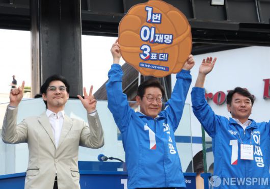[천안=뉴스핌] 김학선 기자 = 이재명 더불어민주당 대통령 후보가 캐스팅보트인 충청권 공략에 나선 25일 오후 충남 천안시 신부문화거리를 찾아 지지를 호소했다. 2025.05.25 yooksa@newspim.com