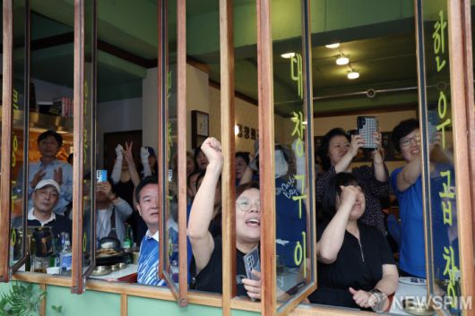 [천안=뉴스핌] 김학선 기자 = 25일 충남 천안시 신부문화거리에서 지지자들이 이재명 더불어민주당 대선후보의 연설에 환호하고 있다. 2025.05.25 yooksa@newspim.com