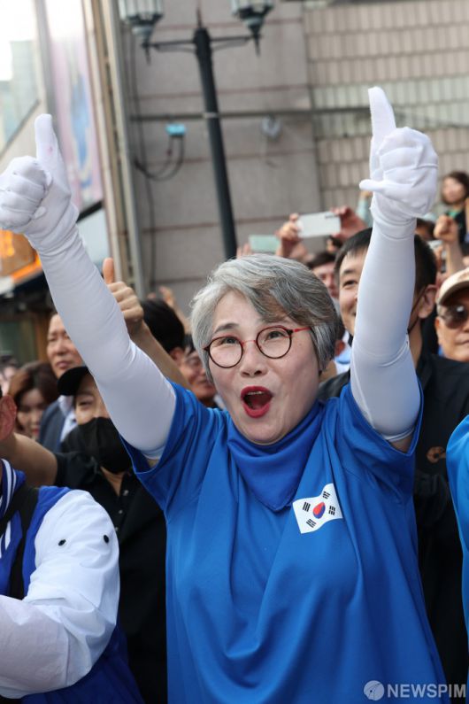 [천안=뉴스핌] 김학선 기자 = 25일 충남 천안시 신부문화거리에서 지지자들이 이재명 더불어민주당 대선후보의 연설에 환호하고 있다. 2025.05.25 yooksa@newspim.com