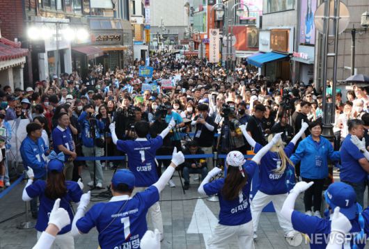 [천안=뉴스핌] 김학선 기자 = 25일 충남 천안시 신부문화거리에서 선거유세단이 이재명 더불어민주당 대선후보 지지를 호소하고 있다. 2025.05.25 yooksa@newspim.com