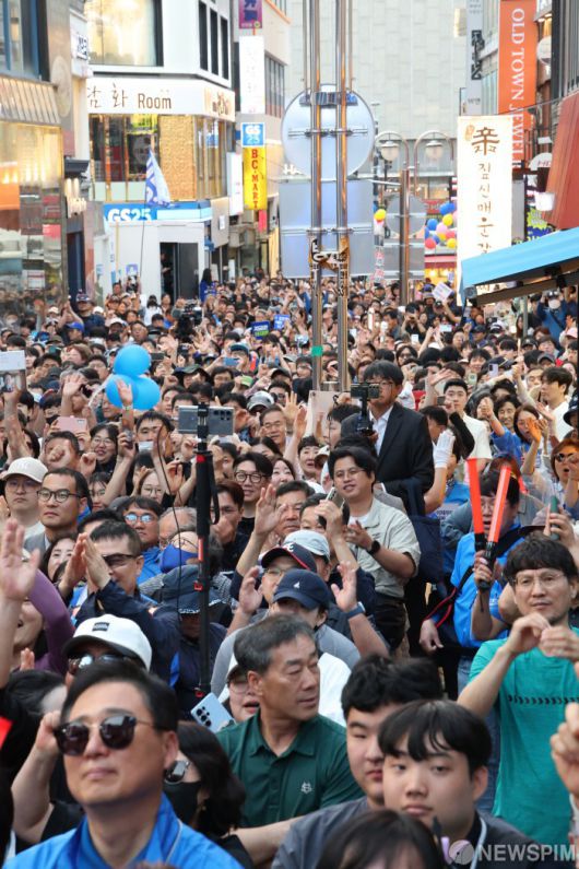[천안=뉴스핌] 김학선 기자 = 25일 충남 천안시 신부문화거리에서 지지자들이 이재명 더불어민주당 대선후보의 연설을 듣고 있다. 2025.05.25 yooksa@newspim.com