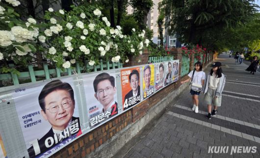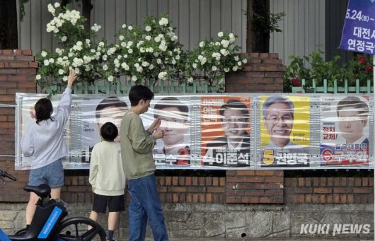 “이번에는 누가 대통령이 될까?” 25일 대전광역시 서구 둔산동의 한 아파트 담장에 만개한 장미꽃 아래 예비 유권자인 어린 학생들이 제21대 대통령 선거 벽보를 살펴보고 있다. |