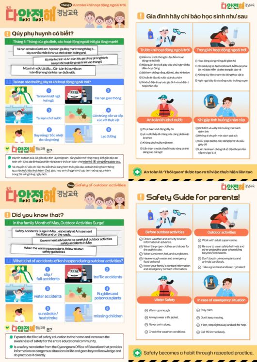 경남교육청은 3월호에서 어린이보호구역 교통안전을, 4월호에서는 산불 예방을 주제로 다뤘으며 5월호는 야외활동이 늘어나는 계절적 특성을 반영해 ‘야외활동 안전’을 주제로 구성했다.