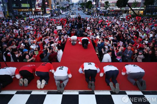 [아산=뉴스핌] 김학선 기자 = 김문수 국민의힘 대선후보가 25일 저녁 충남 아산시 온양온천역에서 열린 선거유세에서 큰절을 하고 있다. 2025.05.25 yooksa@newspim.com |