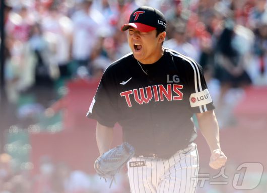 (인천=뉴스1) 김진환 기자 = 25일 오후 인천SSG 랜더스필드에서 열린 '2025 신한 SOL뱅크 KBO리그' LG 트윈스와 SSG 랜더스의 경기, LG 선발 송승기가 6회말 2사 2,3루 상황 SSG 한유섬을 삼진 잡아낸 뒤 포효하고 있다. 2025.5.25/뉴스1