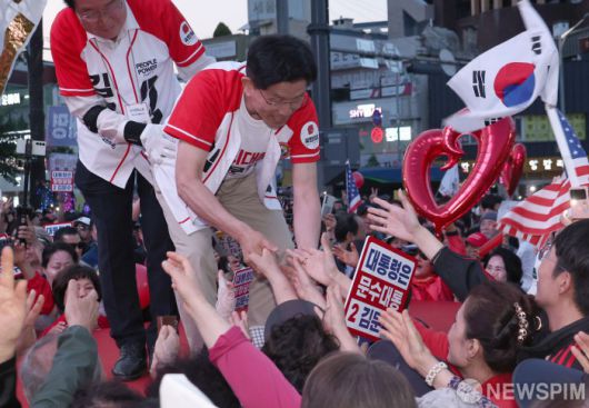 [아산=뉴스핌] 김학선 기자 = 김문수 국민의힘 대선후보가 25일 저녁 충남 아산시 온양온천역에서 열린 선거유세에서 연설을 마치고 지지자들과 악수하고 있다. 2025.05.25 yooksa@newspim.com