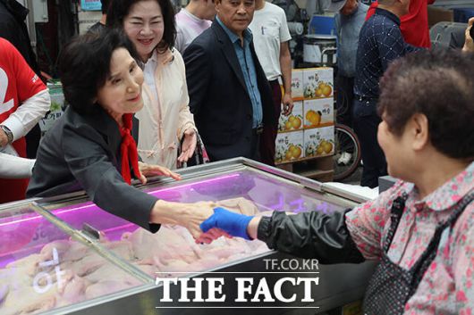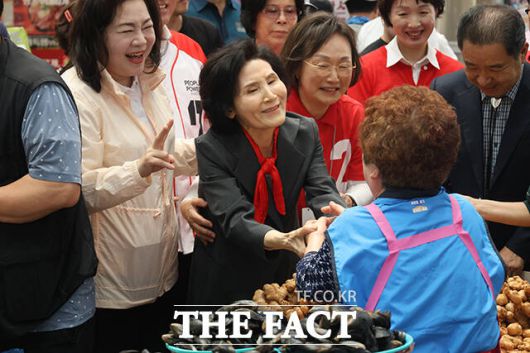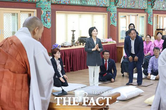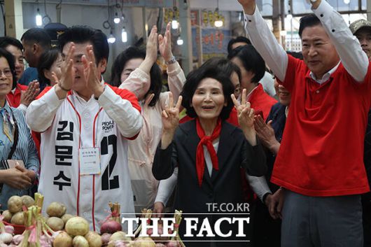 설 여사는 주말을 맞아 충남 예산의 수덕사를 방문해 도신 주지스님을 예방했다. 이어 경기도 평택 통복시장을 찾아 상인들과 시장을 찾은 시민들을 만나 김문수 후보의 지지를 호소했다.