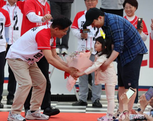 [아산=뉴스핌] 최지환 기자 = 김문수 국민의힘 대선 후보가 25일 오후 충남 아산시 온양온천역 앞 광장에서 열린 ‘기적으로 만들 진짜 아산’ 유세에서 한 어린이에게 꽃다발을 주고 있다. 2025.05.25 choipix16@newspim.com
