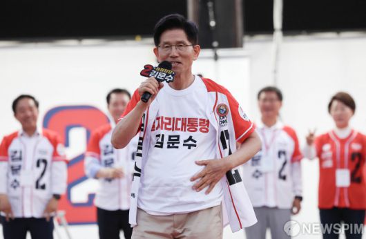 [아산=뉴스핌] 최지환 기자 = 김문수 국민의힘 대선 후보가 25일 오후 충남 아산시 온양온천역 앞 광장에서 열린 ‘기적으로 만들 진짜 아산’ 유세에서 방탄조끼를 안입었다며 겉옷을 벗고 있다. 2025.05.25 choipix16@newspim.com