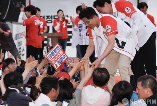 [아산=뉴스핌] 최지환 기자 = 김문수 국민의힘 대선 후보가 25일 오후 충남 아산시 온양온천역 앞 광장에서 열린 ‘기적으로 만들 진짜 아산’ 유세에서 지지자들의 손을 잡아주고 있다. 2025.05.25 choipix16@newspim.com