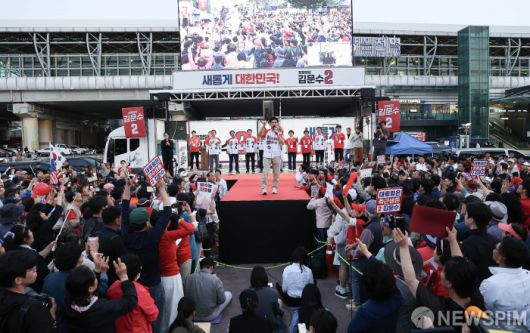 [아산=뉴스핌] 최지환 기자 = 김문수 국민의힘 대선 후보가 25일 오후 충남 아산시 온양온천역 앞 광장에서 열린 '기적으로 만들 진짜 아산' 유세에서 지지를 호소하고 있다. 2025.05.25 choipix16@newspim.com